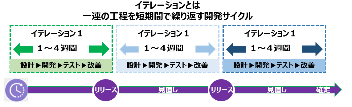 「設計」「開発」「テスト」「改善」 から構成されるイテレーションを設定して、システム開発のサイクルを繰り返します。