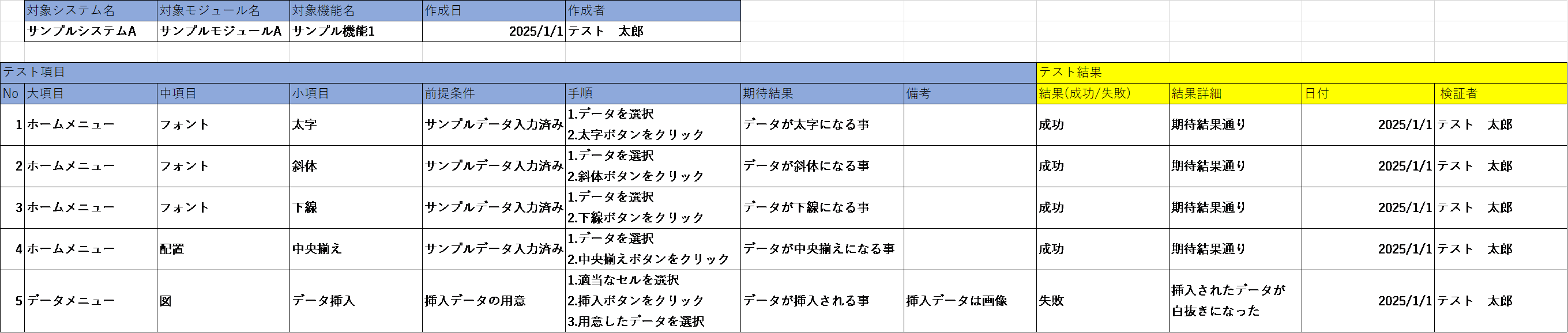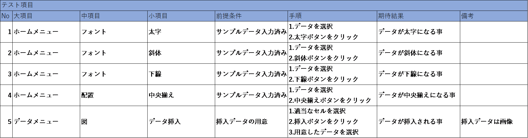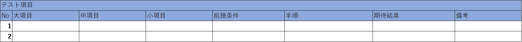 以下サンプルを参考に、「項目名」や「前提条件」、「テストの手順」や「そのテストで期待する結果」の入力枠を作成します。