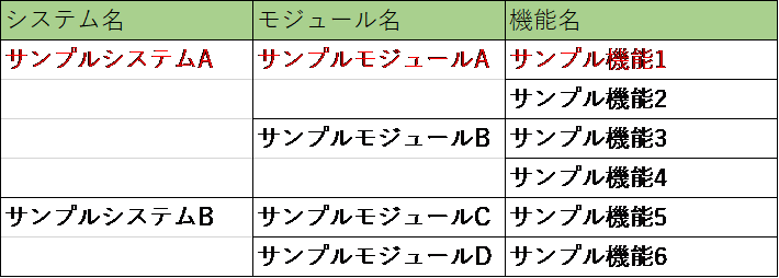 今回は上記赤字のシステム、モジュール、機能が対象なので、以下の様に記載していきます。